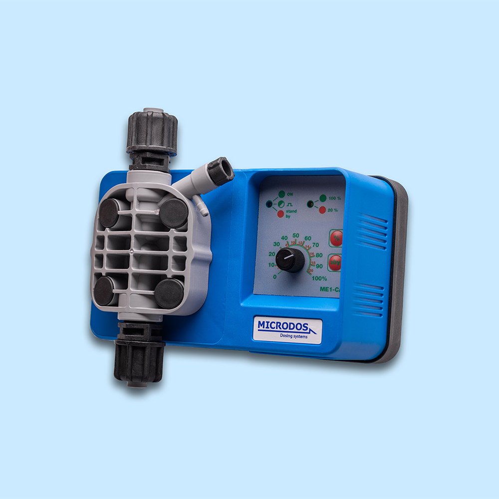 Δοσομετρική αντλία MICRODOS ME1-CA, ιδανική για αυτόματο έλεγχο και τροφοδοσία χημικών σε πισίνες. Εύκολη ρύθμιση παροχής, αξιόπιστη λειτουργία και αντοχή σε διαβρωτικά προϊόντα.